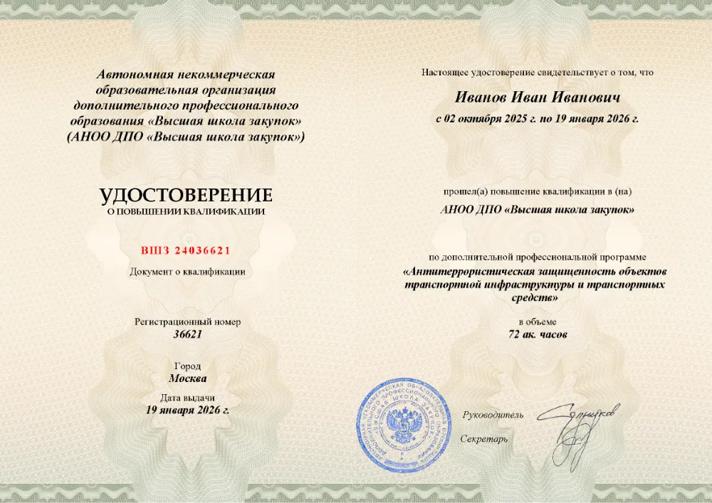 Повышение квалификации, 72 академических часов, 7 модулей: нормативно-правовые основы противодействия терроризму, анализ угроз и рисков, функциональные обязанности ответственных, инженерно-техническая укрепленность, документооборот и действия персонала при ЧС. Онлайн-обучение в в Орле с итоговой аттестацией.