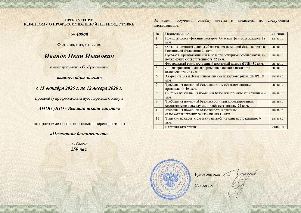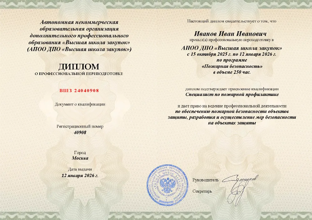 Профессиональная переподготовка, 250 академических часов, 11 модулей: организационные основы и законодательство в области пожарной безопасности, лицензирование и надзор, требования к объектам защиты, проектирование, тушение пожаров и оказание первой помощи пострадавшим. Онлайн-обучение в в Орле с итоговой аттестацией.