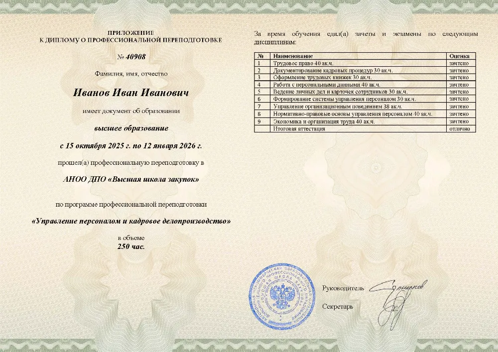 Повышение квалификации, 144 академических часа, 10 модулей: стратегическое кадровое планирование и ситуация на рынке труда, психология управления, документационное обеспечение, развитие, мотивация и вовлеченность персонала, работа с дистанционной занятостью и кадровым резервом. Онлайн-обучение в в Орле с итоговой аттестацией.
