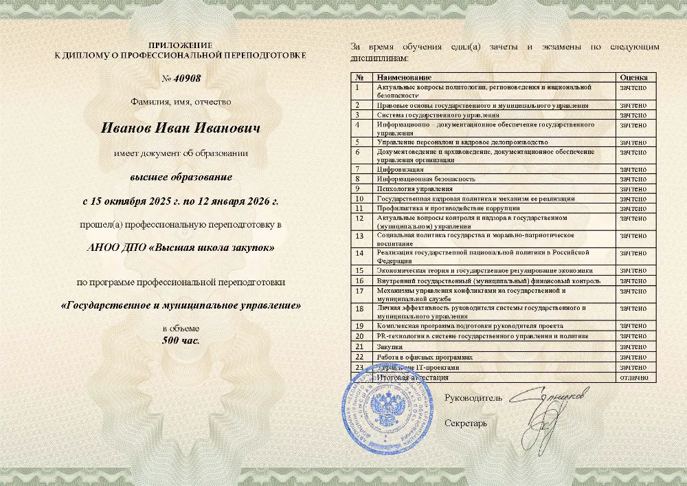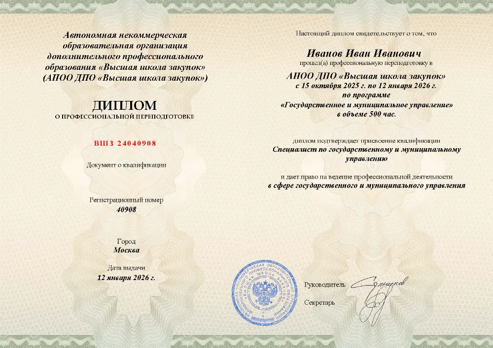 Профессиональная переподготовка, 500 академических часов, 25 модулей: правовые основы и система государственного управления, управление персоналом, финансами и противодействие коррупции, социальная политика и экономическое регулирование, цифровизация, закупки и информационная безопасность. Онлайн-обучение в в Орле с итоговой аттестацией.